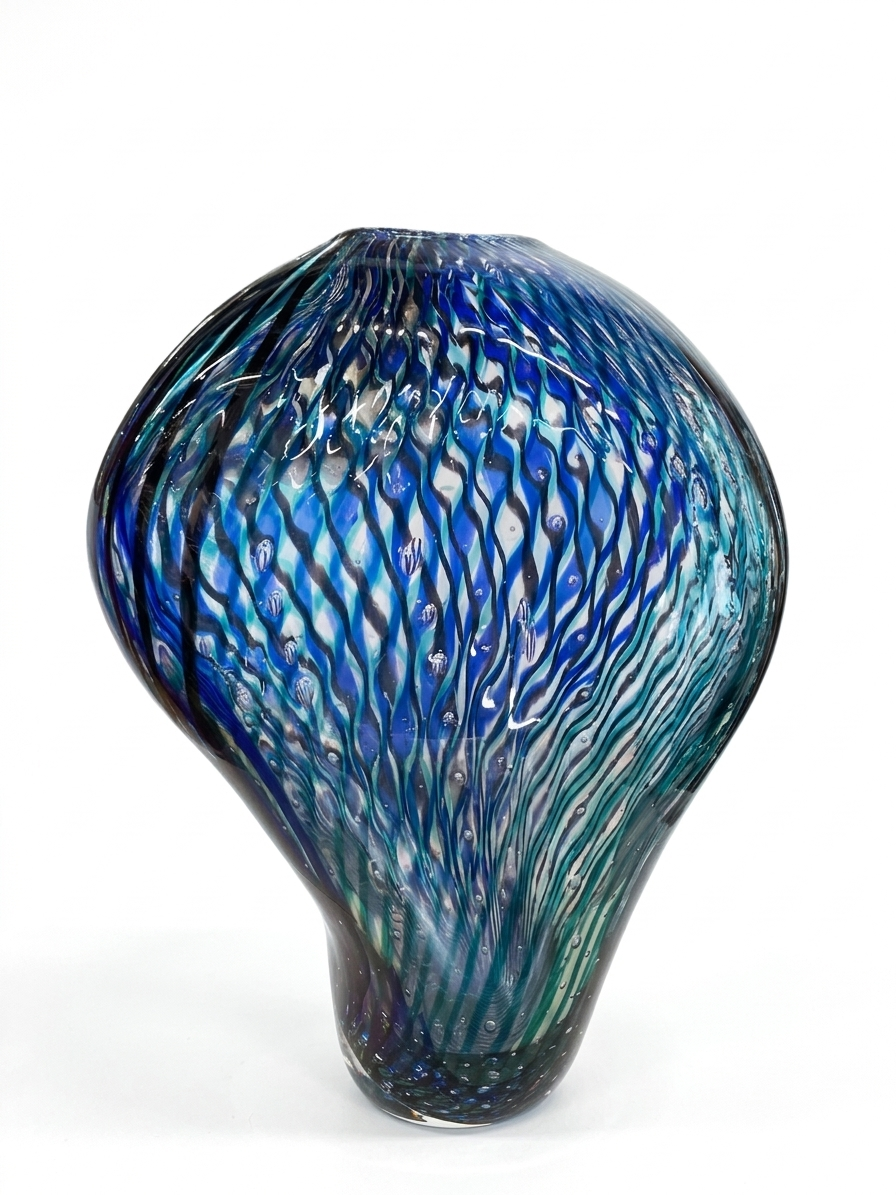 Home / Vases / Hand-blown Blue & Teal Vase w/Ribbon Design
